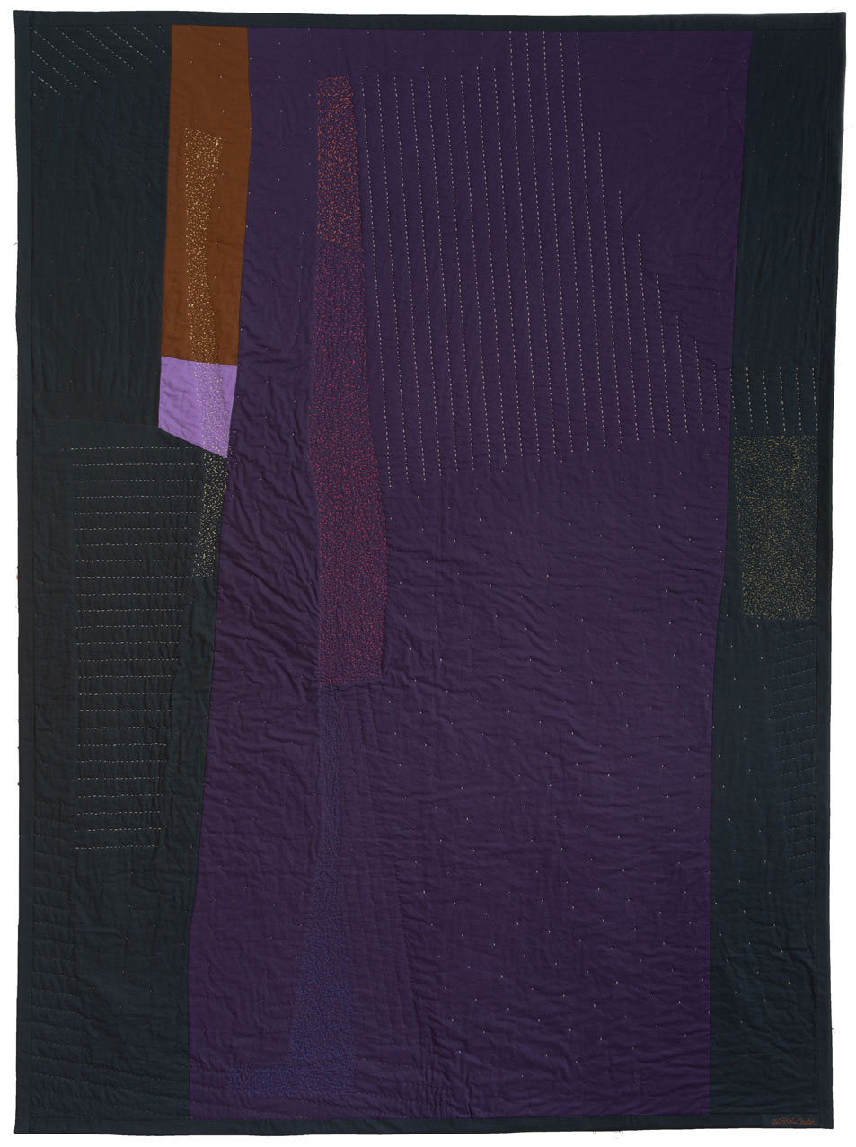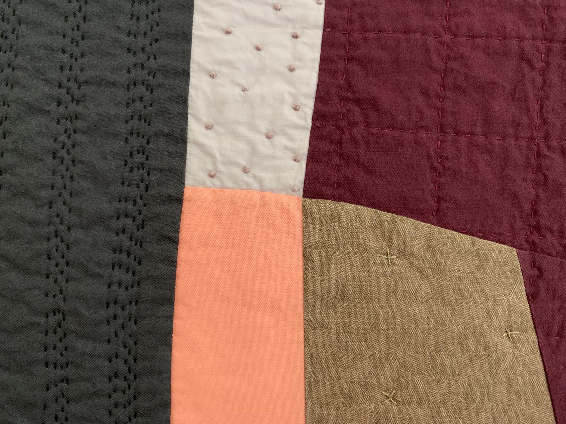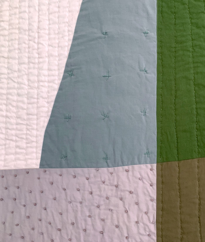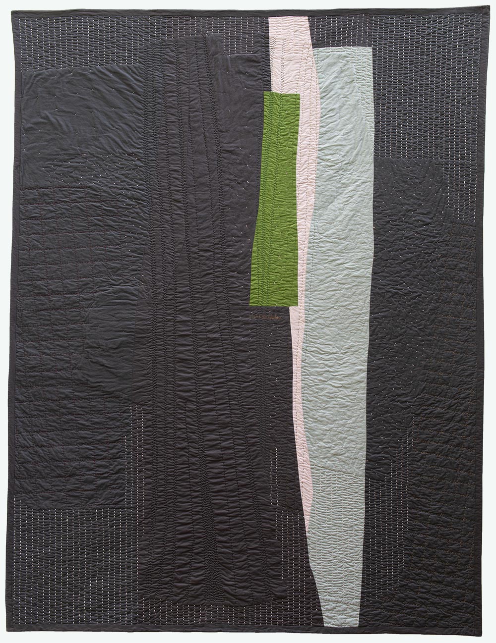 I place two colors side by side; together they are magical. I rearrange the composition to kindle their romance. A muscle twitch contracts my elbow, and a previously obedient seam becomes a distinctive gesture. I add another unexpected line to give the first one company.